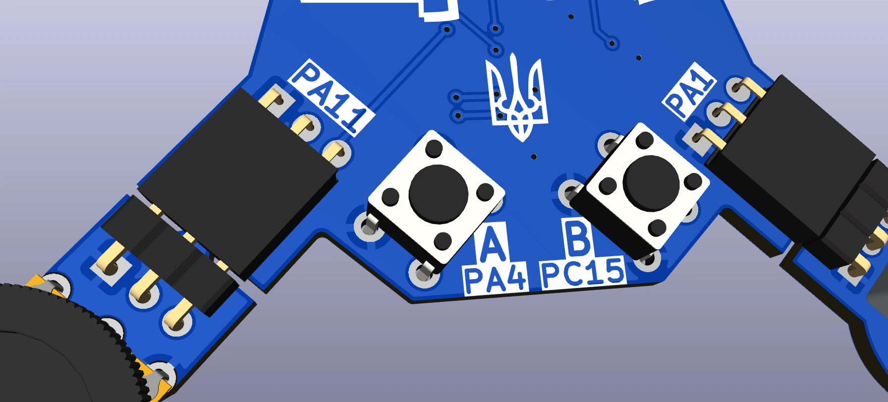 Наш Дрон має 4 кнопки, лише 2 з яких ми можемо використовувати в своїх програмах – кнопка А (підключена до піна PA4) та кнопка B (пін PC15). Ми можемо зчитувати стани (натиснуті чи ні) цих кнопок з нашої програми і реагувати як нам хочеться: наприклад керувати світлодіодами, запускати музику на зумері, вмикати пропелер і т.д.