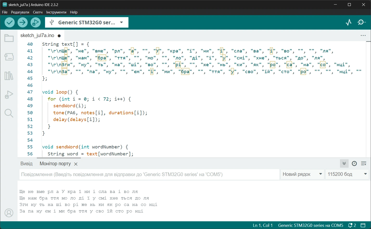 Ви могли помітити, що масив зі словами Гімну має пусті елементи такі як “”. Це тому, що на деякі склади слів припадає більше, ніж одна нота. Тому таким чином ми це обіграли в самому масиві, щоб поки не виводити наступне слово, коли нота стосується ще попереднього. Також Ви могли помітити дивні символи (\r\n) на початку кожного рядку Гімну. Це спеціальні символи, які вказують панелі Монітор порту почати друкувати слова з нового рядка